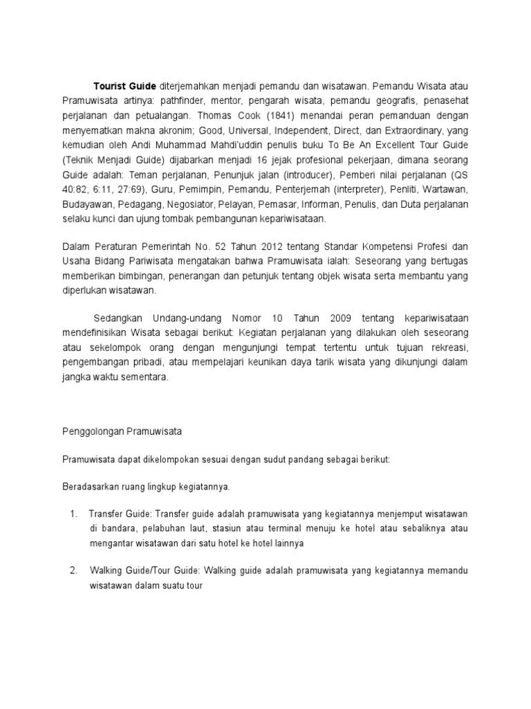 Bab 3 Pemanduan Wisata Tour Guiding Pdf Fre. Wisatawan adalah orang yang melakukan perjalanan untuk berlibur berobat berbisnis berolahraga serta menuntut ilmu dan mengunjungi tempattempat yang indah atau sebuah negara tertentu. Guide selalu dikaitkan dengan orang bule turis wisatawan.