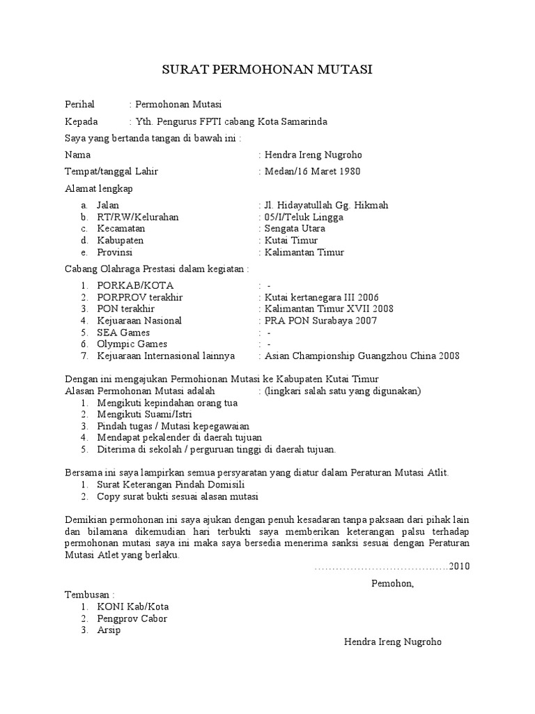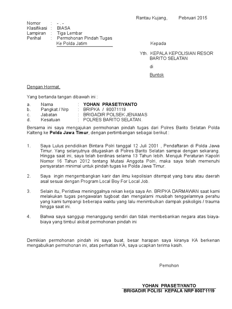 Anda dapat melihat dengan jelas Contoh Surat Permohonan Menjadi Anggota Polri menggunakan Desktop anda Tablet Android atau iPhone dan perangkat Smartphone lainnya secara gratis. Contoh Surat Permohonan Mutasi Dalam dunia kerja mutasi adalah hal yang lumrah kita temukan. Surat Permohonan Pindah Tugas.